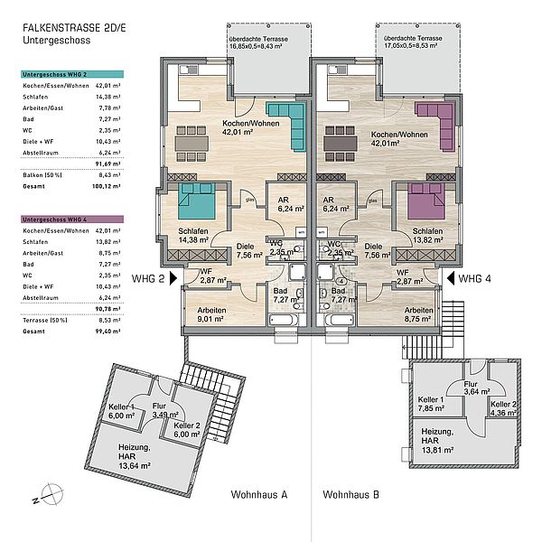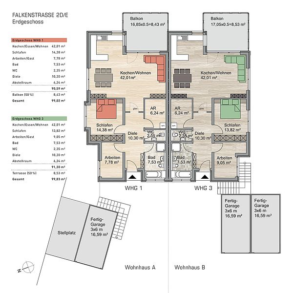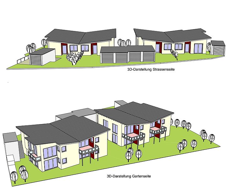 Das hochwertige Doppelhaus besteht aus vier Wohneinheiten. Alle Wohnungen sind mit Fußbodenheizung, Parkettboden und Balkon oder Terrasse in südöstlicher Ausrichtung ausgestattet. Für jede Einheit steht eine unterkellerte Garage bzw. ein Stellplatz zur Verfügung.